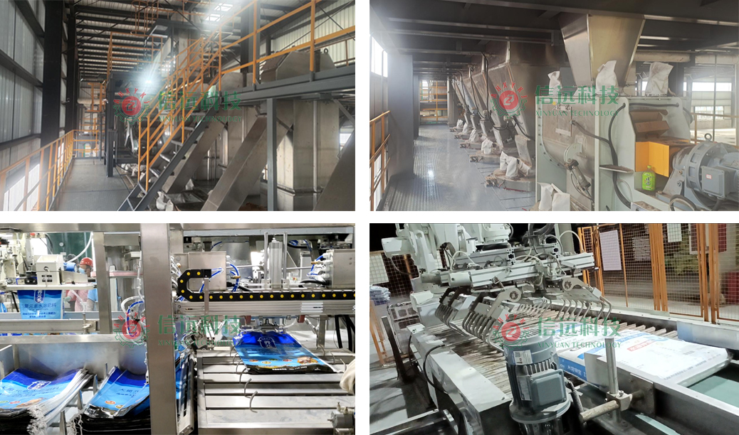 信遠科技為廣大肥料行業(yè)客戶推薦的這套年產(chǎn)2-5萬噸的固體粉劑水溶肥設備配置方案,適用于充填容量為5-50kg的編織袋、PP/PE袋,可以包裝大量元素水溶肥、中量元素水溶肥、微量元素水溶肥、含氨基酸水溶肥、含腐植酸水溶肥、含黃腐酸鉀水溶肥等不同配方的固體粉劑水溶肥產(chǎn)品。該套方案從前端的配料工段到后端的碼垛工段均采用了全自動化的設備系統(tǒng),在批量化的流水線作業(yè)中,提高了生產(chǎn)效率,穩(wěn)定了產(chǎn)品質量,降低了生產(chǎn)成本,縮短了生產(chǎn)周期,保證了生產(chǎn)的均衡性和產(chǎn)品的標準化。