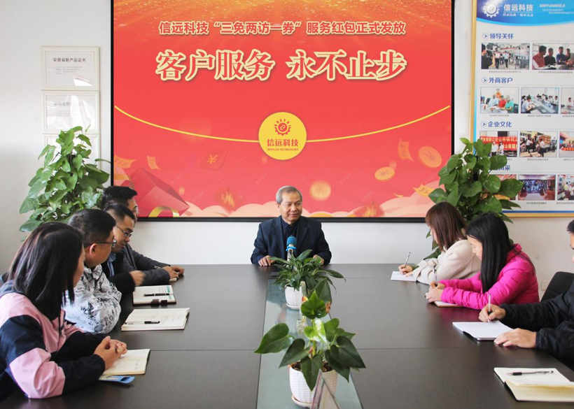 2021年11月25日上午,安徽信遠(yuǎn)包裝科技有限公司組織召開(kāi)“客戶服務(wù) 永不止步—“三免兩訪一券”服務(wù)紅包正式發(fā)放”啟動(dòng)儀式,信遠(yuǎn)科技常務(wù)副總經(jīng)理鐘總主持啟動(dòng)儀式,各相關(guān)部門(mén)主要負(fù)責(zé)人參加了會(huì)議。