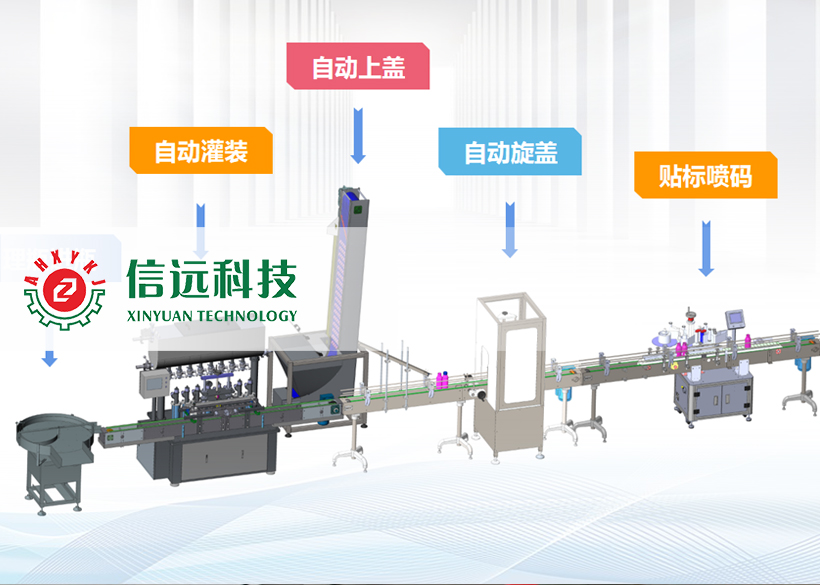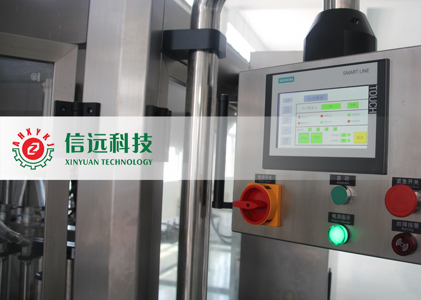 信遠(yuǎn)科技瓶裝液體全自動灌裝機(jī)組,由理瓶機(jī)、灌裝機(jī)、上蓋/旋蓋機(jī)和貼標(biāo)噴碼機(jī)組成??梢怨嘌b單瓶容量在50-1000ml范圍之間的液體物料,生產(chǎn)企業(yè)可以根據(jù)自己的需要,選擇不同型號的灌裝機(jī)和配套輔機(jī)。這套機(jī)組設(shè)備采用不銹鋼材質(zhì)設(shè)計(jì)制造,適用于食品、化工、醫(yī)藥等行業(yè)不帶氣體的流體、半流體物料的計(jì)量灌裝,具有自動完成理瓶、進(jìn)瓶、定位、灌裝、出瓶、上蓋、旋蓋、鋁箔封口、貼標(biāo)、噴碼等一系列功能。