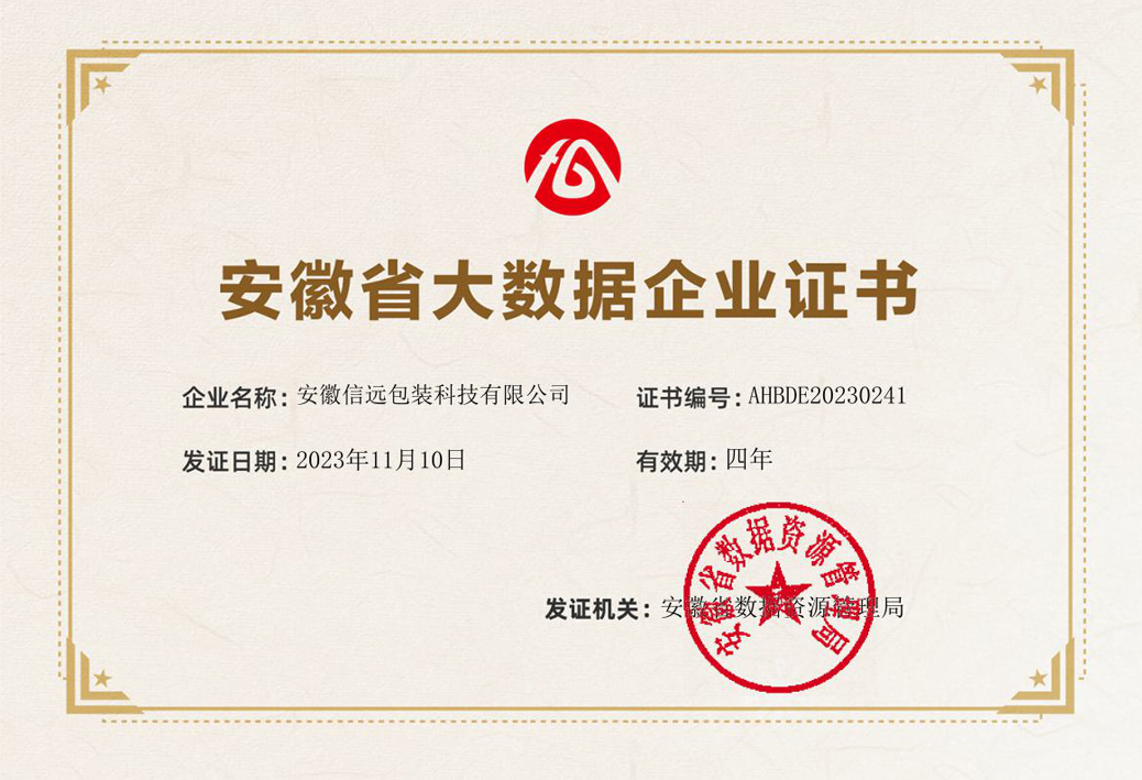 11月3日,安徽省數(shù)據(jù)資源管理局網(wǎng)站發(fā)布《關(guān)于2023年度安徽省大數(shù)據(jù)企業(yè)名單的公示》。安徽信遠(yuǎn)包裝科技有限公司憑借在自動(dòng)化設(shè)備領(lǐng)域長期的數(shù)據(jù)積累和數(shù)據(jù)應(yīng)用,以及借助大數(shù)據(jù)信息助推兩化融合發(fā)展的優(yōu)秀成績,成功榮獲“安徽省大數(shù)據(jù)企業(yè)”稱號。該稱號是信遠(yuǎn)科技繼榮獲安徽省新產(chǎn)品、安徽省著名商標(biāo)、安徽省專精特新企業(yè)等多項(xiàng)認(rèn)定后,又一項(xiàng)省級榮譽(yù)認(rèn)定。