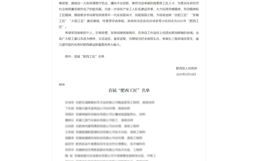 近日,肥西縣人民政府發(fā)布《關(guān)于命名2023年首屆“肥西工匠”的通報(bào)》。安徽信遠(yuǎn)包裝科技有限公司項(xiàng)目中心總監(jiān)、電氣工程部總監(jiān)王聲根同志被命名為首屆“肥西工匠”稱號(hào)。
