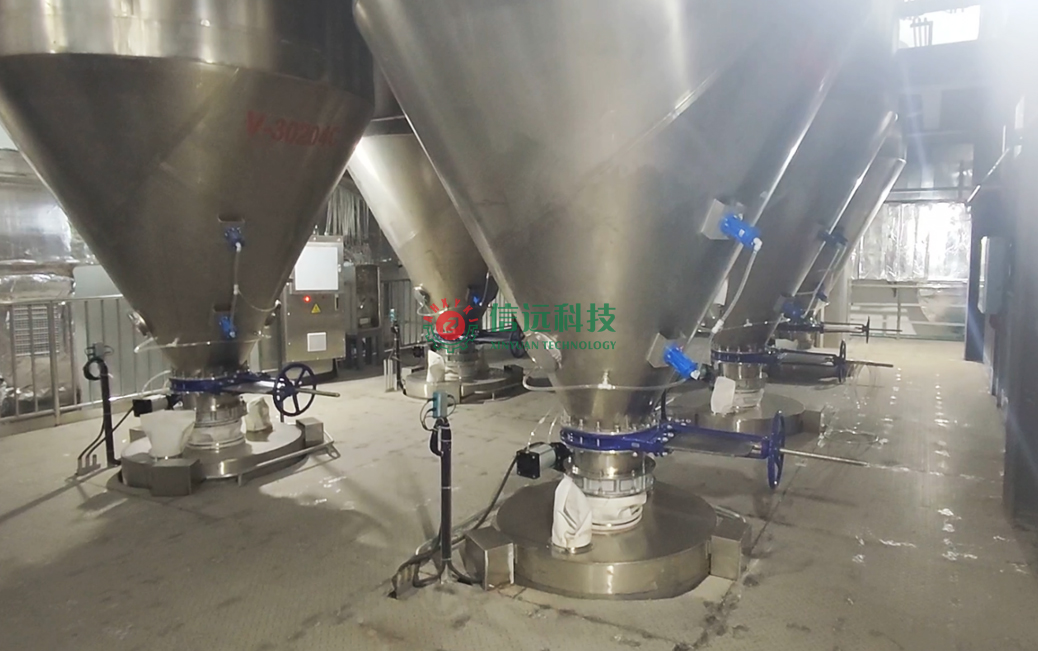 過渡料倉下方連接的是配料倉。配料倉為圓錐形結構,由料倉主體、料倉蓋、連接法蘭、稱重底座,振動底座、減壓帽等組成,內鏡面材質、無死角。每個配料倉為獨立稱重設計,配料快、精度高,各料倉主體連接螺旋輸送機,供料電機帶動螺桿轉動配料,變頻控制輸料速度,快、慢兩級加料,可有效控制配料精度,也被稱為矢量法自動配料,是一套技術非常成熟的配料系統(tǒng)。