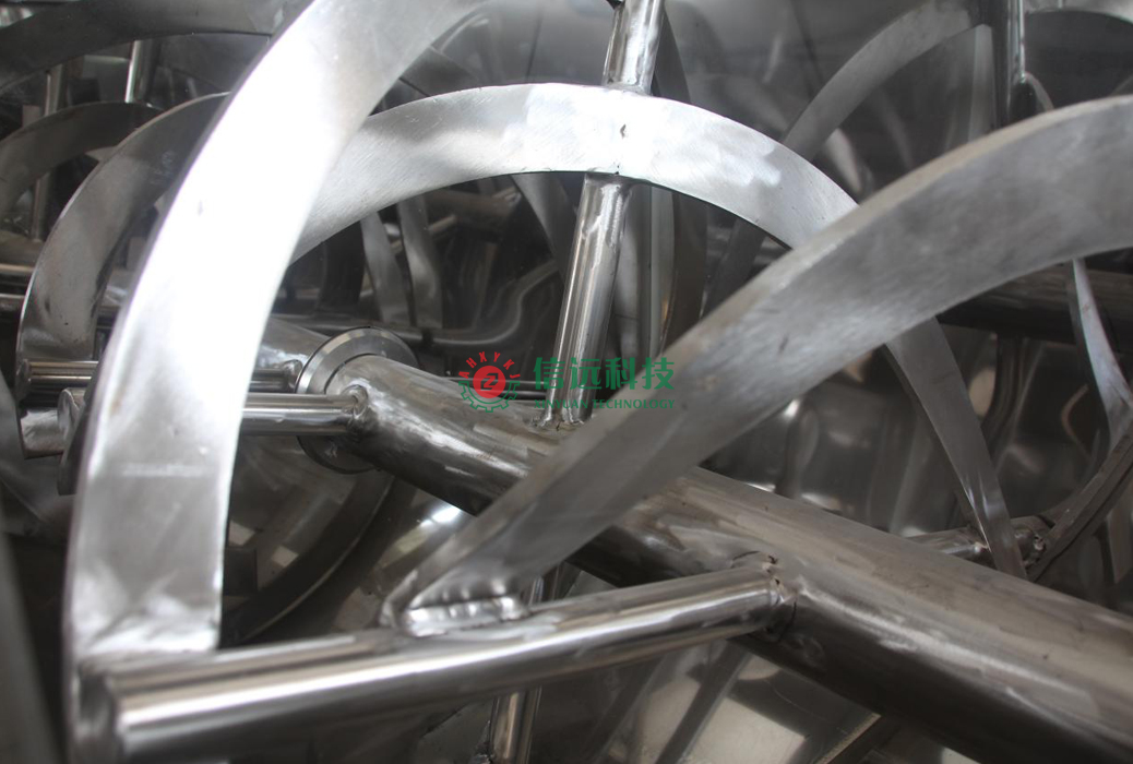 信遠(yuǎn)科技臥式螺帶混合機(jī)的結(jié)構(gòu)為臥式筒體,主要由電機(jī)、減速機(jī)、機(jī)架、聯(lián)軸器、主軸軸承、攪拌螺帶、進(jìn)料口、出料口、筒體、筒蓋、出料閥等部件組成?;旌蠙C(jī)攪拌器主軸上,通常采用盤繞兩組方向相反的內(nèi)、外雙層螺帶,工作時(shí),快速攪拌物料。物料同時(shí)被外層螺帶向筒體中心推送,和被內(nèi)層螺帶向筒體兩側(cè)推送,形成循環(huán)交錯(cuò)的對(duì)流,最終實(shí)現(xiàn)混合效果。開機(jī)出料保證物料被外層螺帶向筒體中心推送從而保證出料干凈。