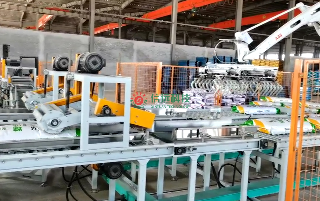 安徽信遠(yuǎn)包裝科技有限公司設(shè)計(jì)制造的全自動(dòng)包裝碼垛生產(chǎn)線設(shè)備,是一套重袋包裝碼垛系統(tǒng),由上袋機(jī)、包裝機(jī)、縫包機(jī)、噴碼機(jī)、輸送理包系統(tǒng)、碼垛機(jī)器人和軌道托盤庫等裝置組成,可以自動(dòng)完成取袋、上袋、開袋、套袋、夾袋和計(jì)量充填,袋內(nèi)重量達(dá)到設(shè)定值時(shí),自動(dòng)停止充填并松袋落袋,抱袋裝置自動(dòng)推送至縫包機(jī)前,完成包裝袋封口。成品袋在輸送過程中,自動(dòng)完成倒包、振實(shí)、壓平等理包整形后,機(jī)器人進(jìn)行抓取碼垛,叉車搬運(yùn)入庫。