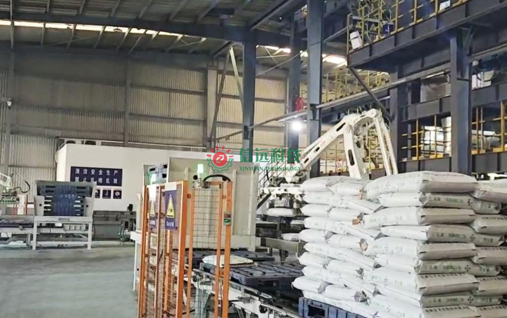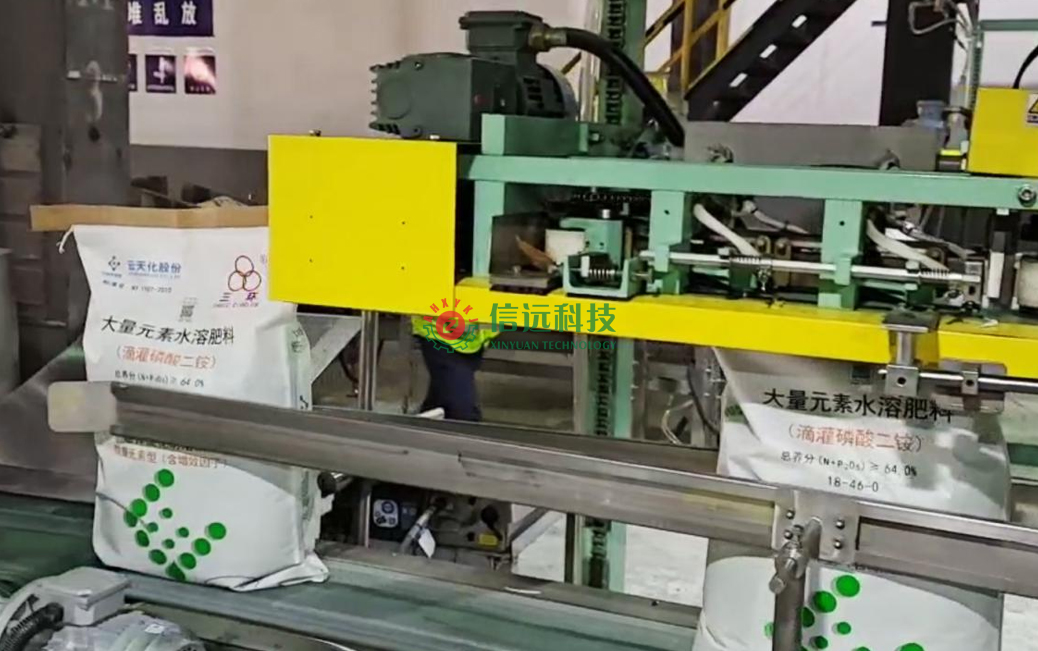 安徽信遠(yuǎn)包裝科技有限公司設(shè)計(jì)制造的水溶肥全自動(dòng)包裝碼垛生產(chǎn)線設(shè)備,是一套固體粉劑重袋包裝碼垛系統(tǒng),由上袋機(jī)、包裝機(jī)、縫包機(jī)、噴碼機(jī)、輸送理包系統(tǒng)、碼垛機(jī)器人和托盤庫(kù)等裝置組成,可以自動(dòng)完成取袋、上袋、開袋、套袋、夾袋和計(jì)量充填,袋內(nèi)重量達(dá)到設(shè)定值時(shí),自動(dòng)停止充填并松袋落袋,抱袋裝置自動(dòng)移栽至縫包機(jī)前,完成包裝袋封口。成品袋在輸送過程中,自動(dòng)完成倒包、振實(shí)、壓平等理包整形后(托盤庫(kù)自動(dòng)同步供盤),機(jī)器人進(jìn)行抓包碼垛,叉車搬運(yùn)入庫(kù)。