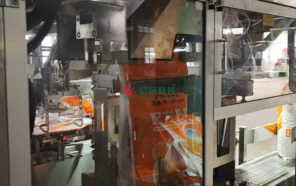 安徽信遠包裝科技有限公司設計制造的摻混肥全自動包裝碼垛生產(chǎn)線設備,是一套重袋包裝碼垛系統(tǒng),由上袋機、包裝機、縫包機、噴碼機、輸送理包系統(tǒng)和碼垛機器人等裝置組成,可以自動完成取袋、上袋、開袋、套袋、夾袋和計量充填,袋內(nèi)重量達到設定值時,自動停止充填并松袋落袋,抱袋裝置自動移栽至縫包機前,完成包裝袋封口。成品袋在輸送過程中,自動完成倒包、振實、壓平等理包整形后,機器人進行抓包碼垛,叉車搬運入庫。