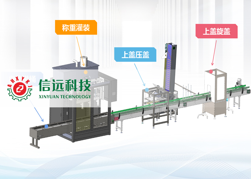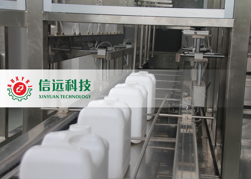 信遠科技桶裝液體全自動灌裝機組,由灌裝機和上蓋旋蓋機/上蓋壓蓋機組成。可以灌裝5-30L范圍之間的桶裝液體物料,生產(chǎn)企業(yè)可以根據(jù)自己的需要,選擇不同型號的灌裝機和配套輔機。這套機組設(shè)備采用不銹鋼材質(zhì)設(shè)計制造,適用于食品、化工、醫(yī)藥等行業(yè)不帶氣體的流體、半流體物料的計量灌裝,具有自動完成進桶、定位、灌裝、出桶、上蓋、旋蓋/壓蓋、噴碼等一系列功能。